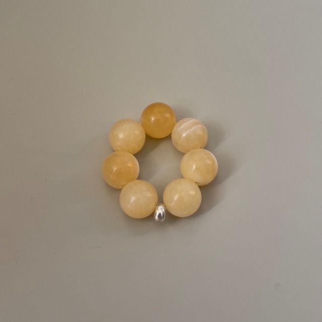 【unu】stone ring -honey stone - (silver) unu初のリングシリーズ。 ハニーストーンは、イギリスのコッツウォルズ地方で採れる天然石の一種で、蜂蜜のような色合いの石です。 金運上昇、気持ちが明るくなり積極的になるなどの効果もあると言われるパワーストーンです。 大きめの天然石リングは1つはめるだけで 抜け感のあるおしゃれな雰囲気を作り出してくれます。 また、ぷちっとついたチェコビーズのパーツを見せる付け方や、手のひら側に回して敢えて見せない付け方と2wayでお楽しみいただけます。 その時のお洋服や気分で遊ぶように変えてみて下さい。 天然石それぞれが持つ個性を楽しんで頂けたら幸いです。 使用していると金属部分が黒ずんでくることがありますが、柔らかい布などで磨いて頂くと艶が戻ります。 天然石やパールを使用したハンドメイド商品になりますので個体差がございます がご了承くださいませ。 お風呂や、海、プールでのご着用はできるだけお控えください。 color : シルバー material : 天然石、チェコビーズ、テグス サイズ 約7号〜13号(フリーサイズですが締め具合により若干のサイズ差があることがございます。) 伸びる透明のテグスを使っているため 多少のサイズ変動は可能です。 発送目安 1週間程度 送料 350円(ポスト投函)