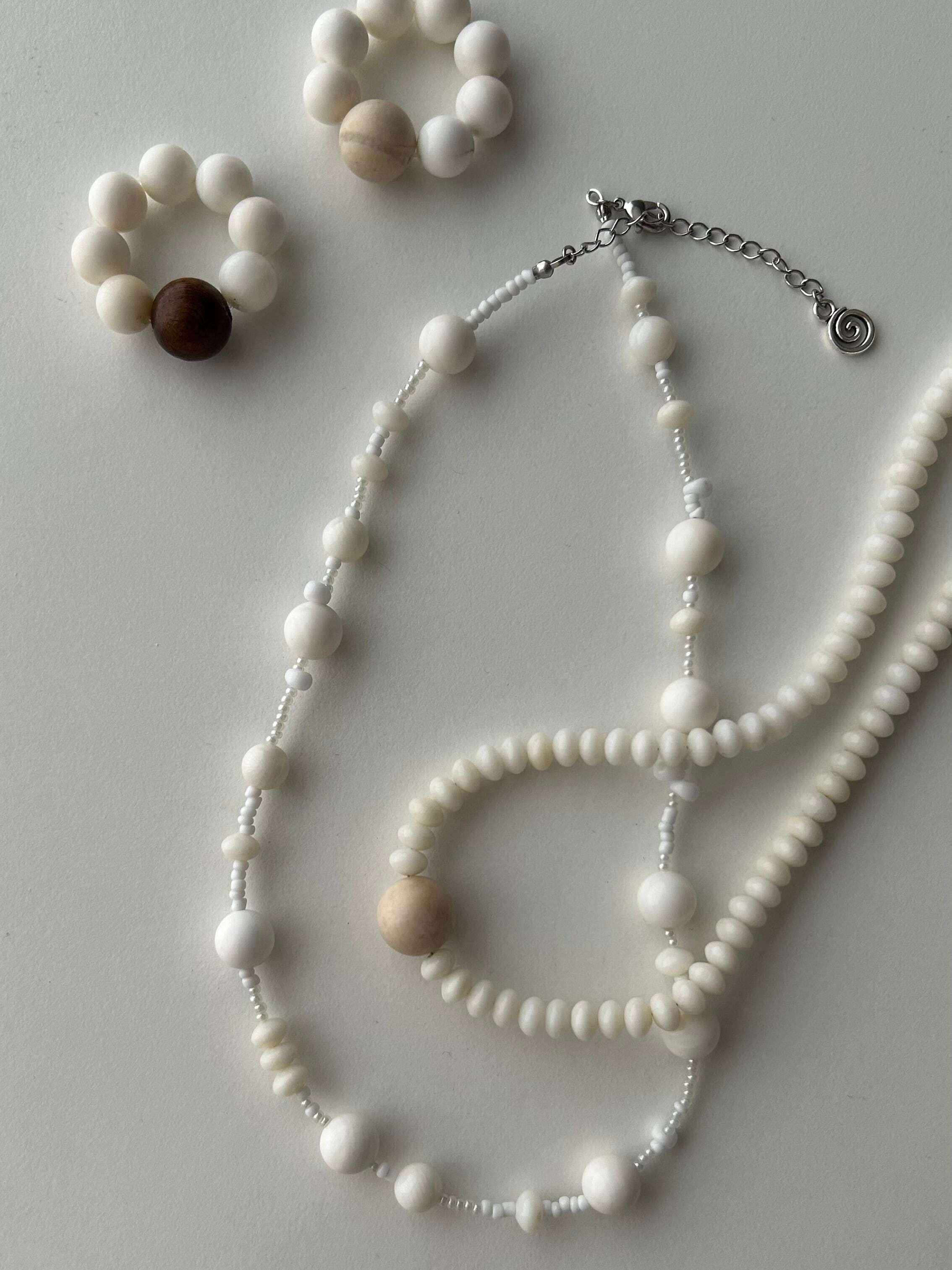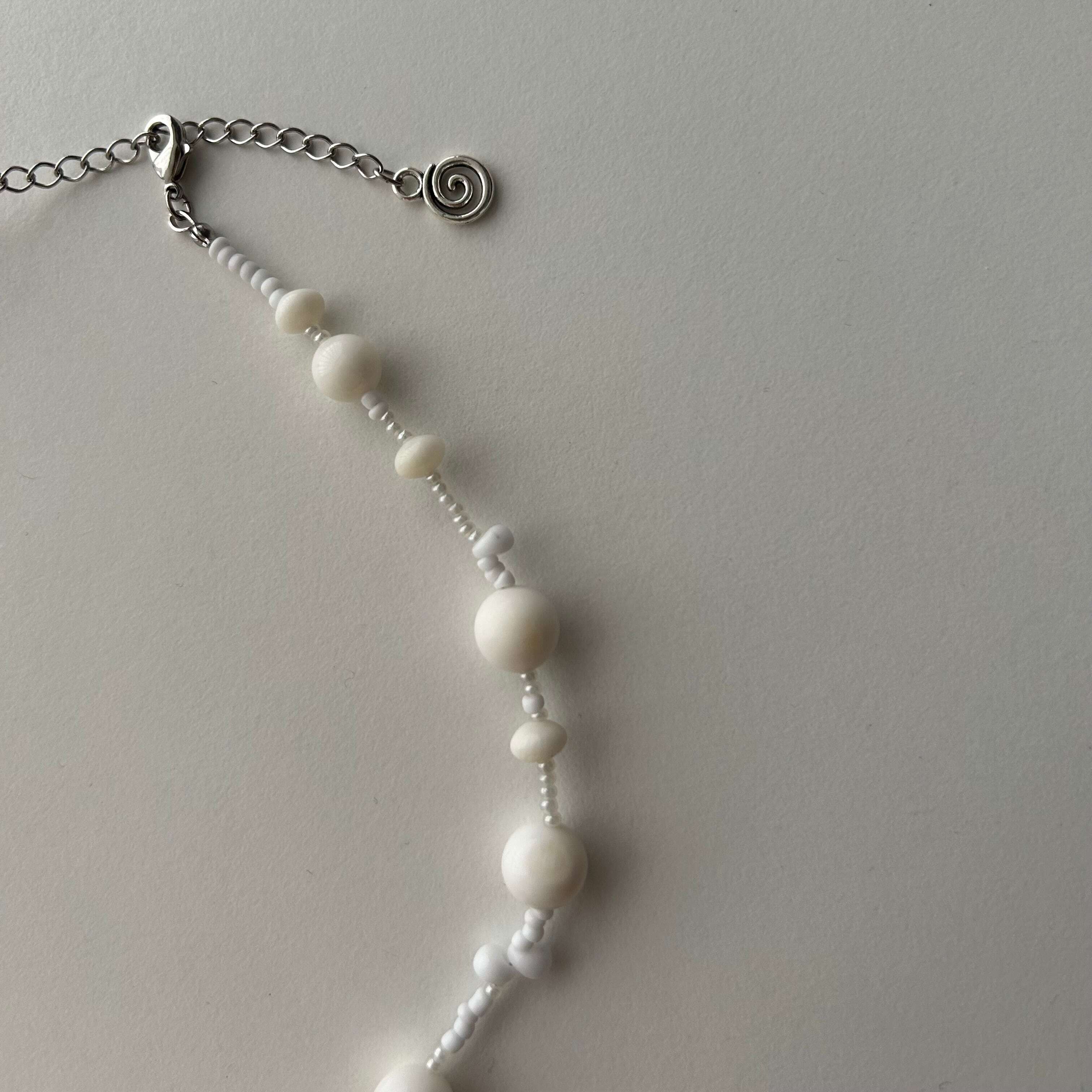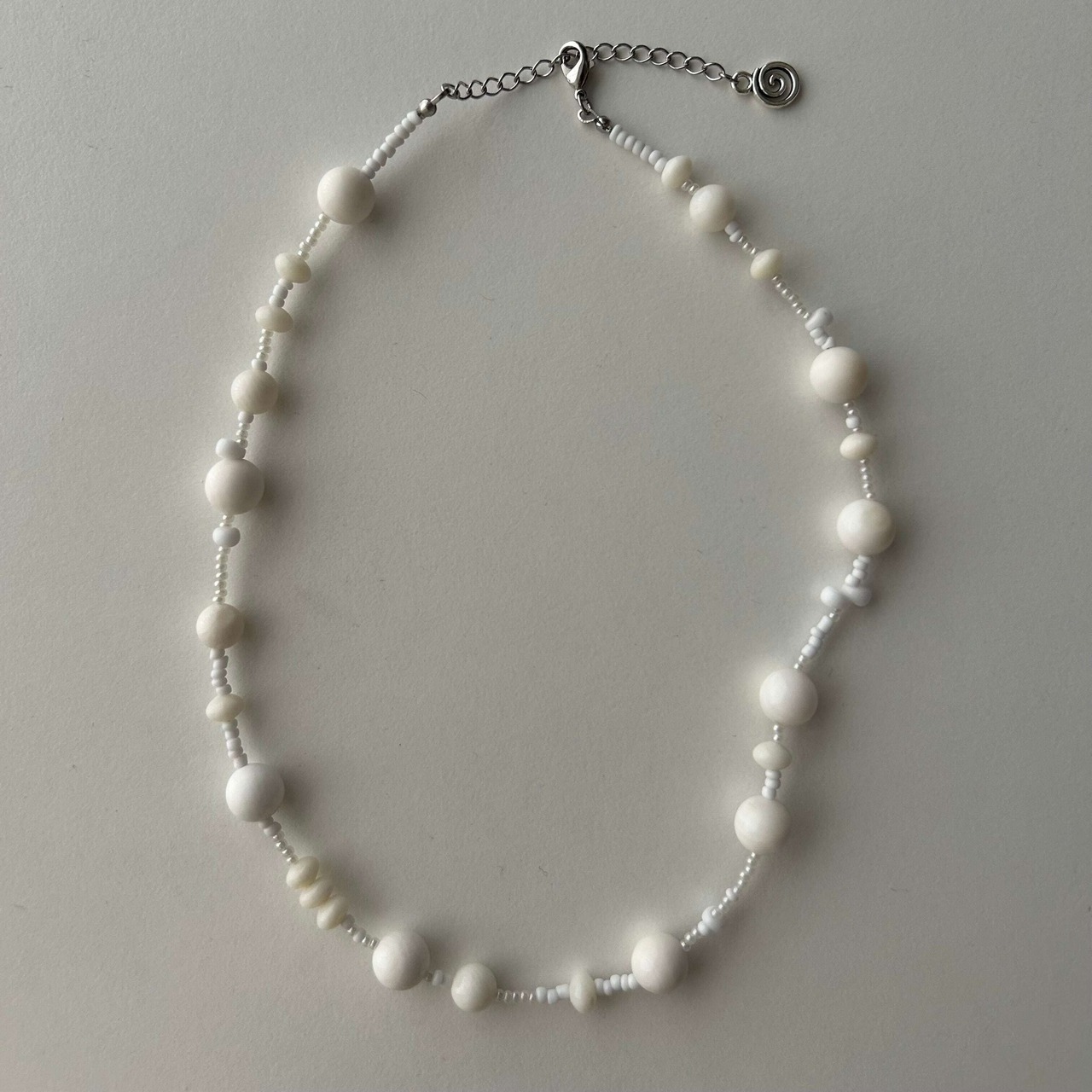 様々な大きさのwhite shellと白珊瑚、ガラスビーズを組み合わせたモードでありカジュアルさも併せ持つアイテム。