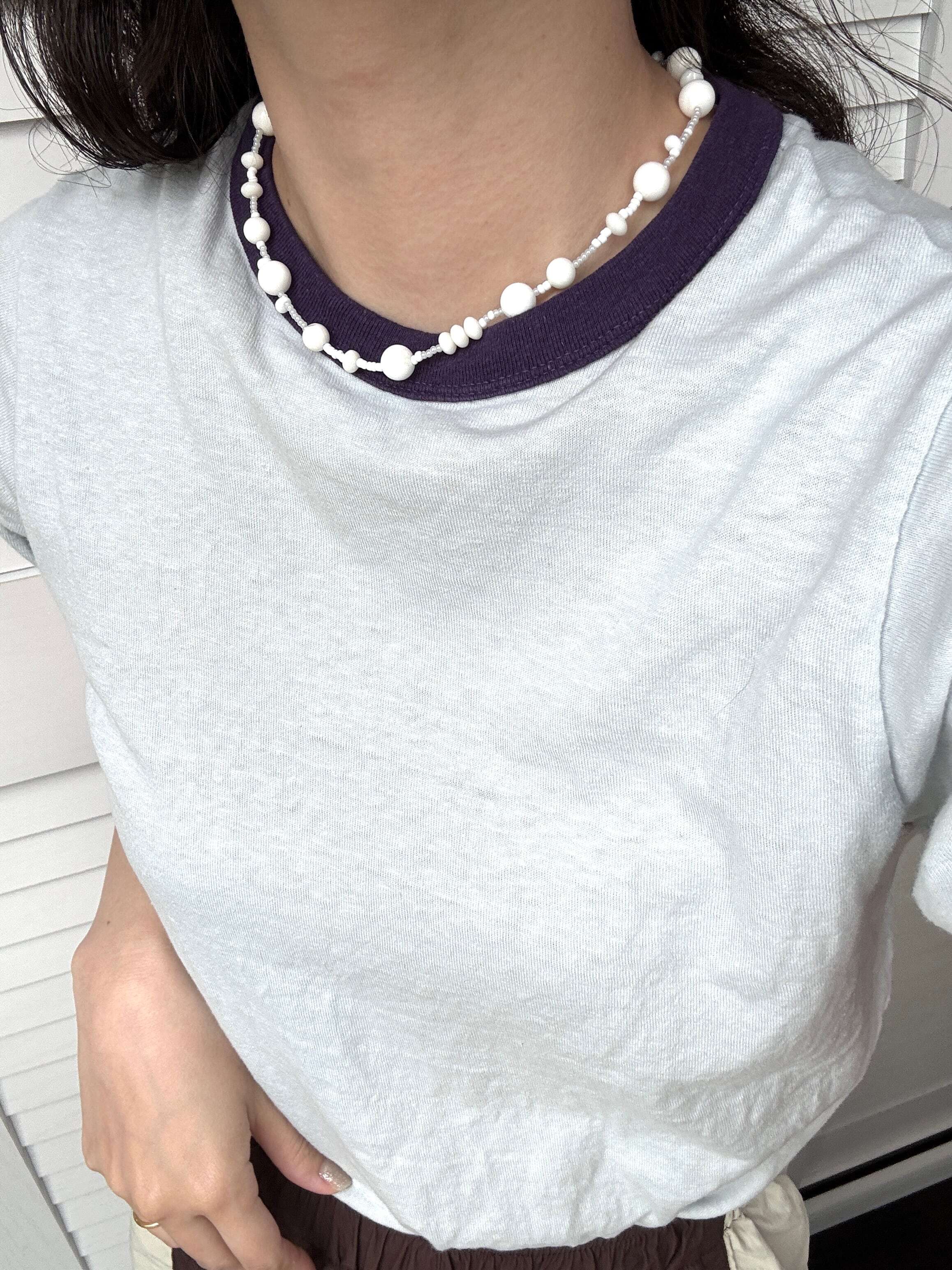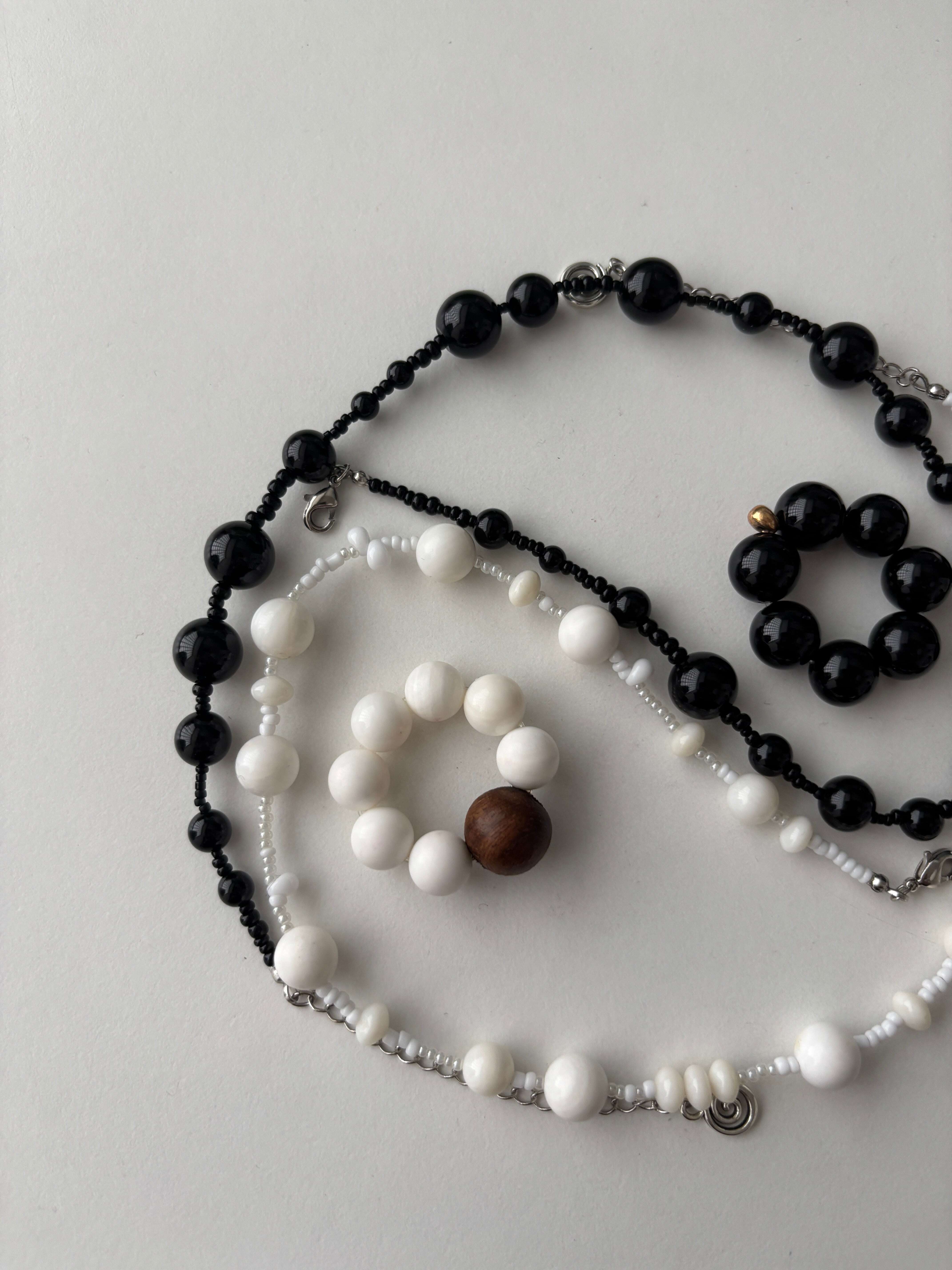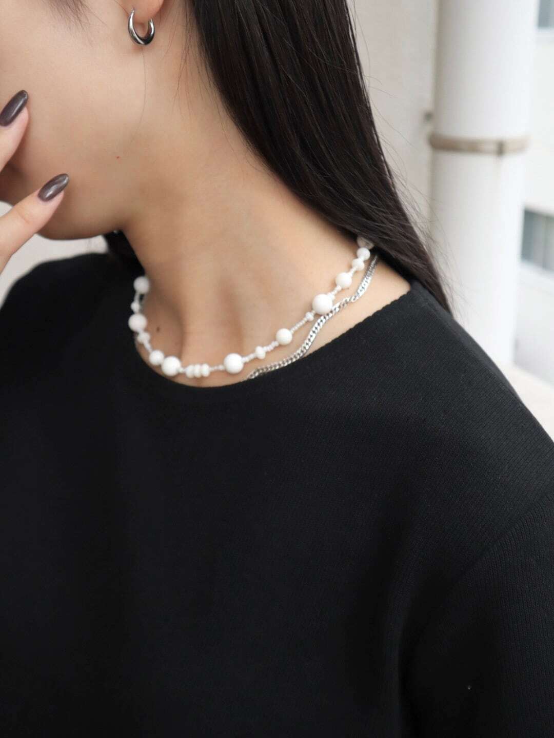 様々な大きさのwhite shellと白珊瑚、ガラスビーズを組み合わせたモードでありカジュアルさも併せ持つアイテム。