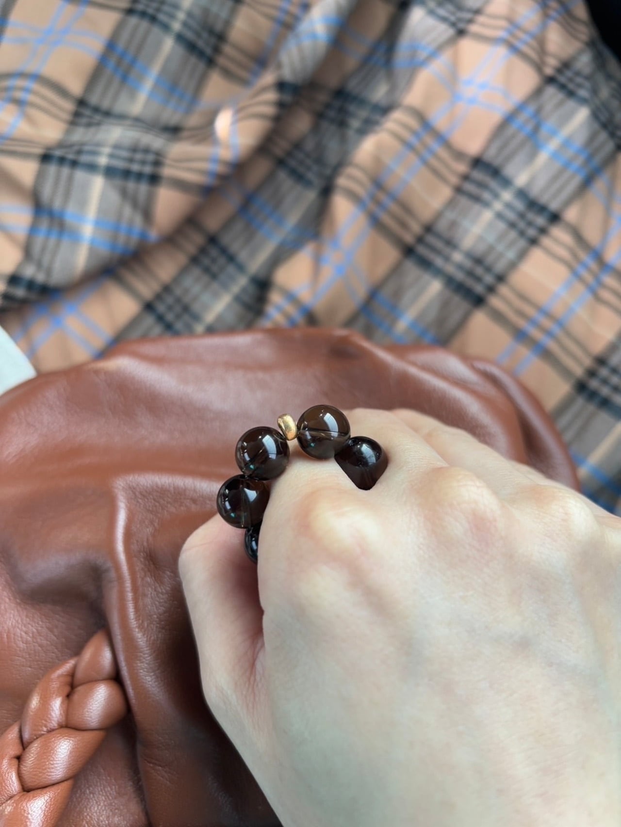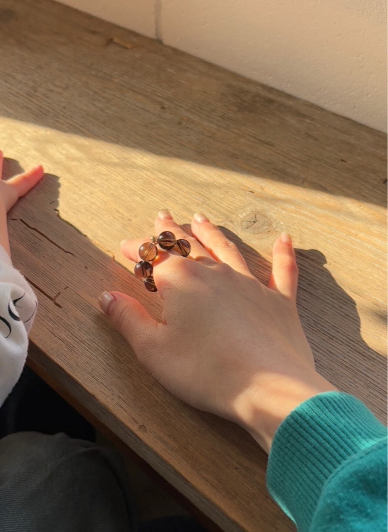 また、ぷちっとついたチェコビーズのパーツを見せる付け方や、手のひら側に回して敢えて見せない付け方と2wayでお楽しみいただけます。