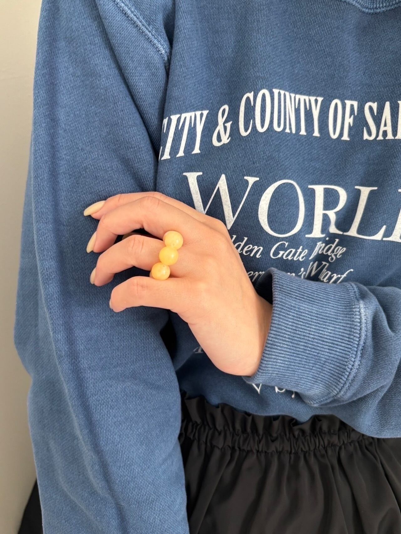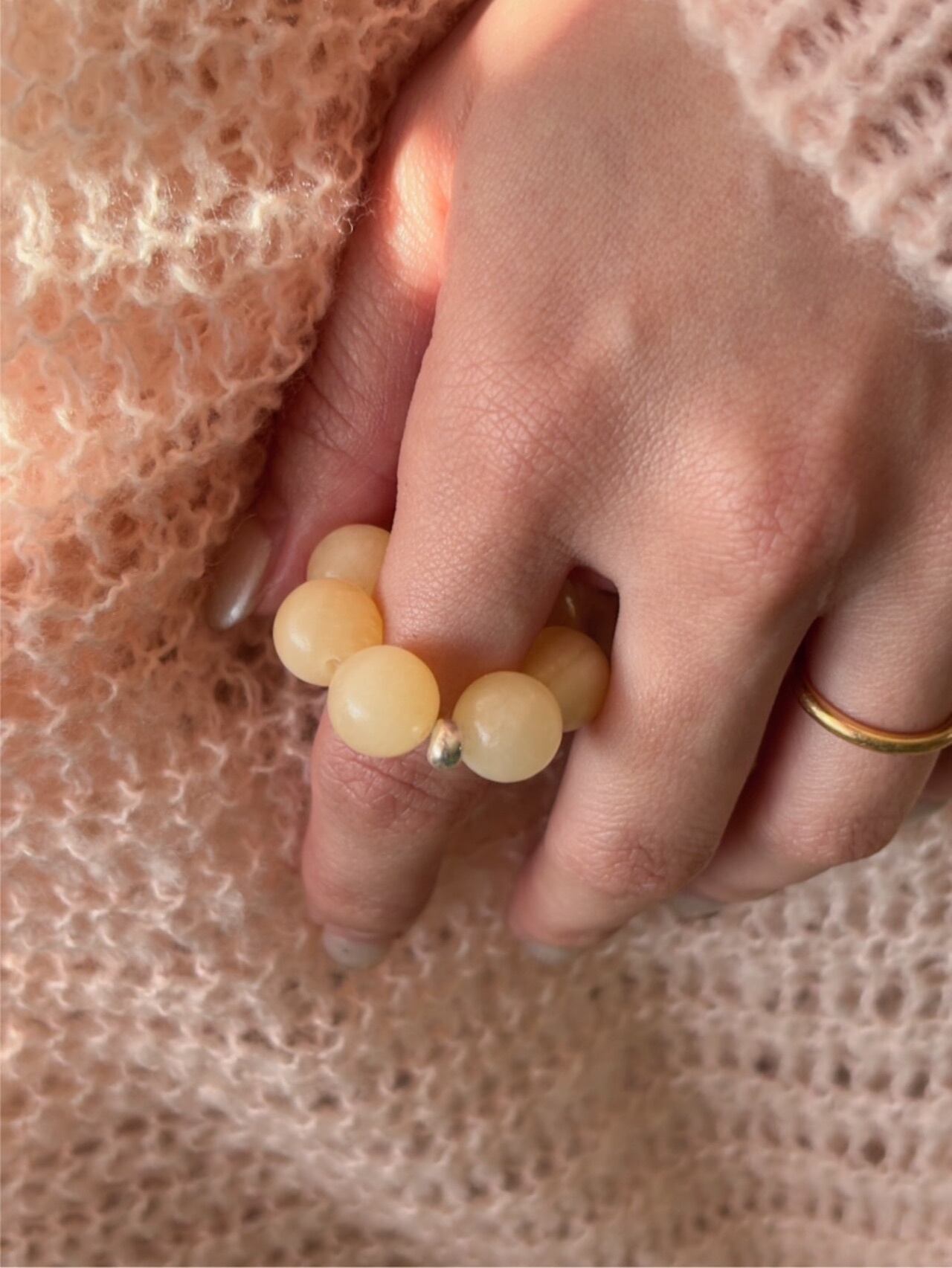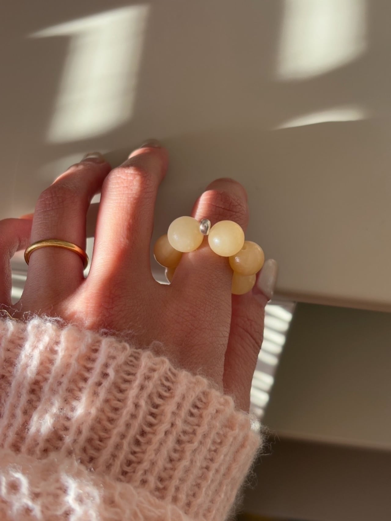 また、ぷちっとついたチェコビーズのパーツを見せる付け方や、手のひら側に回して敢えて見せない付け方と2wayでお楽しみいただけます。