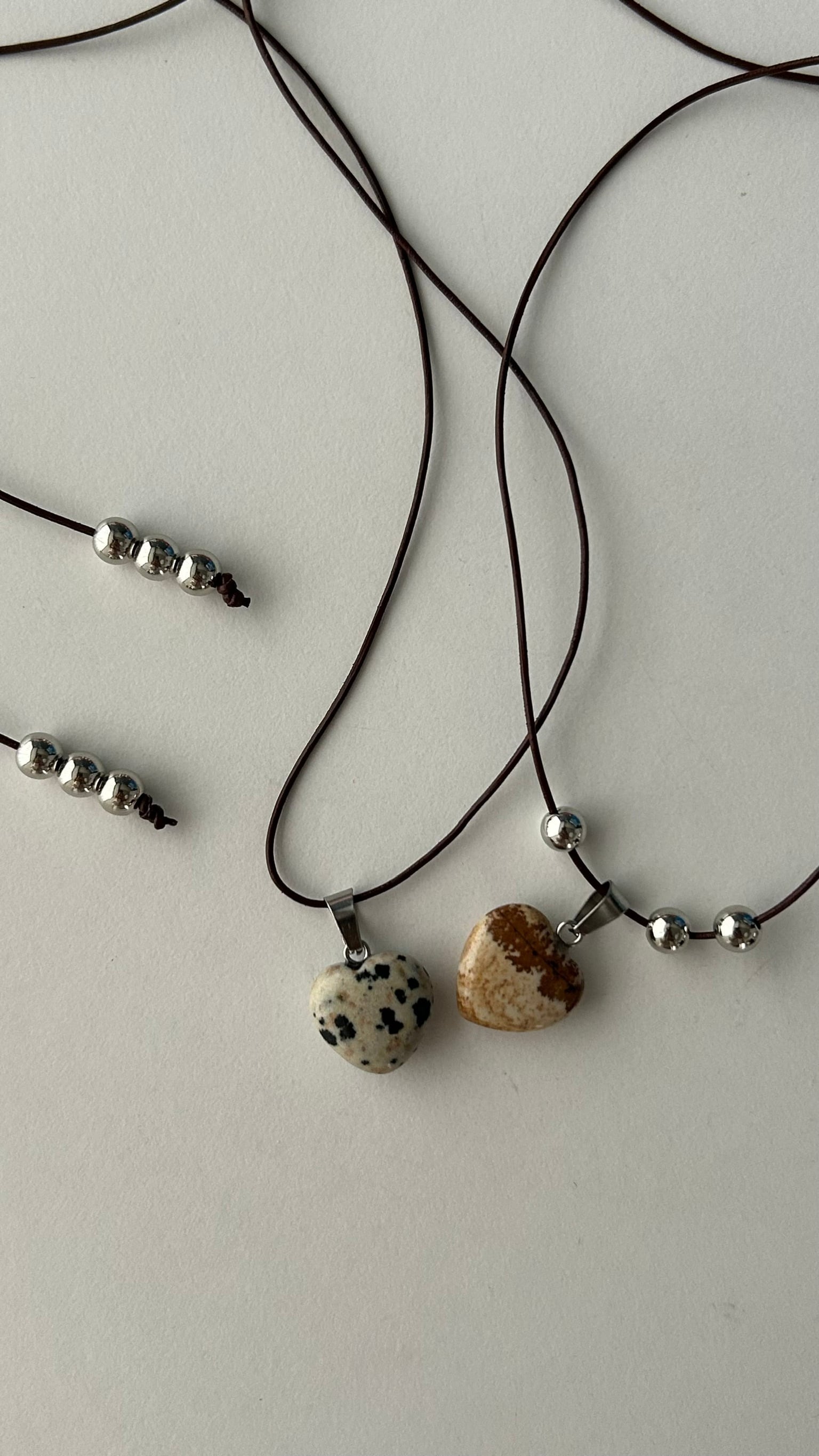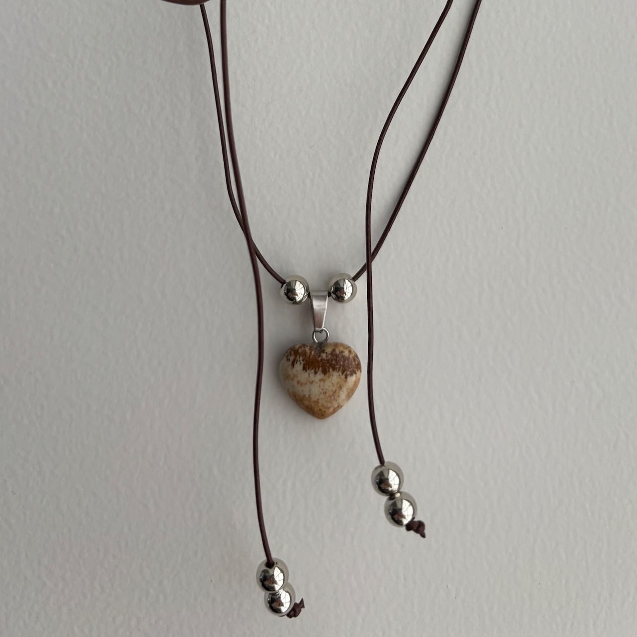 茶色のレザーの細めの紐で少しカジュアルさも出しつつ、シルバーの珠やパーツで雰囲気に抜け感をプラス。