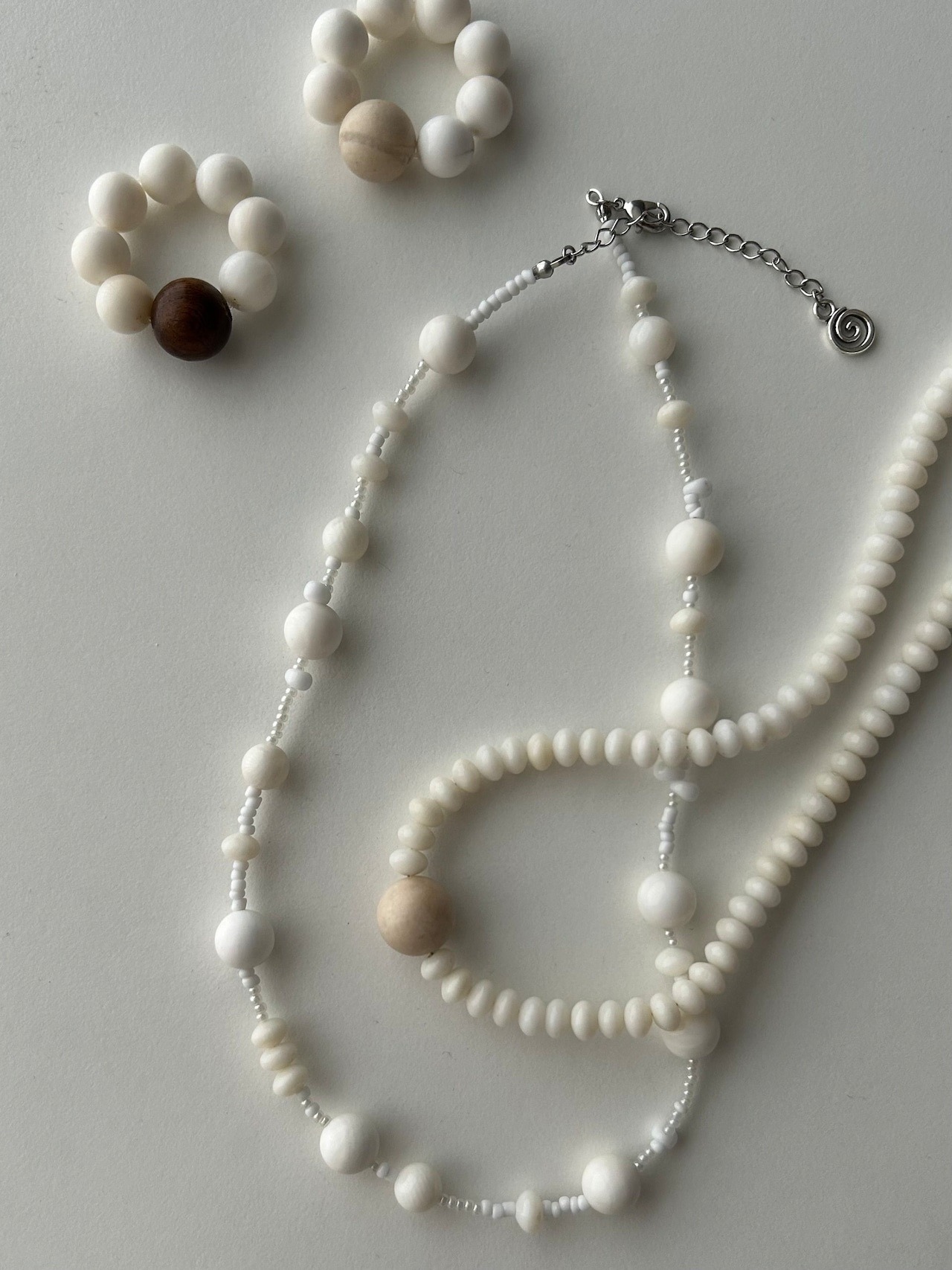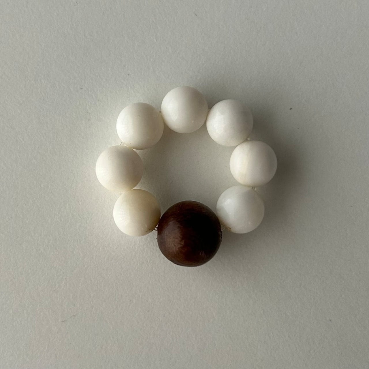 ホワイトシェルとウッドを合わせて、モードさもカジュアルさもある雰囲気のリング。