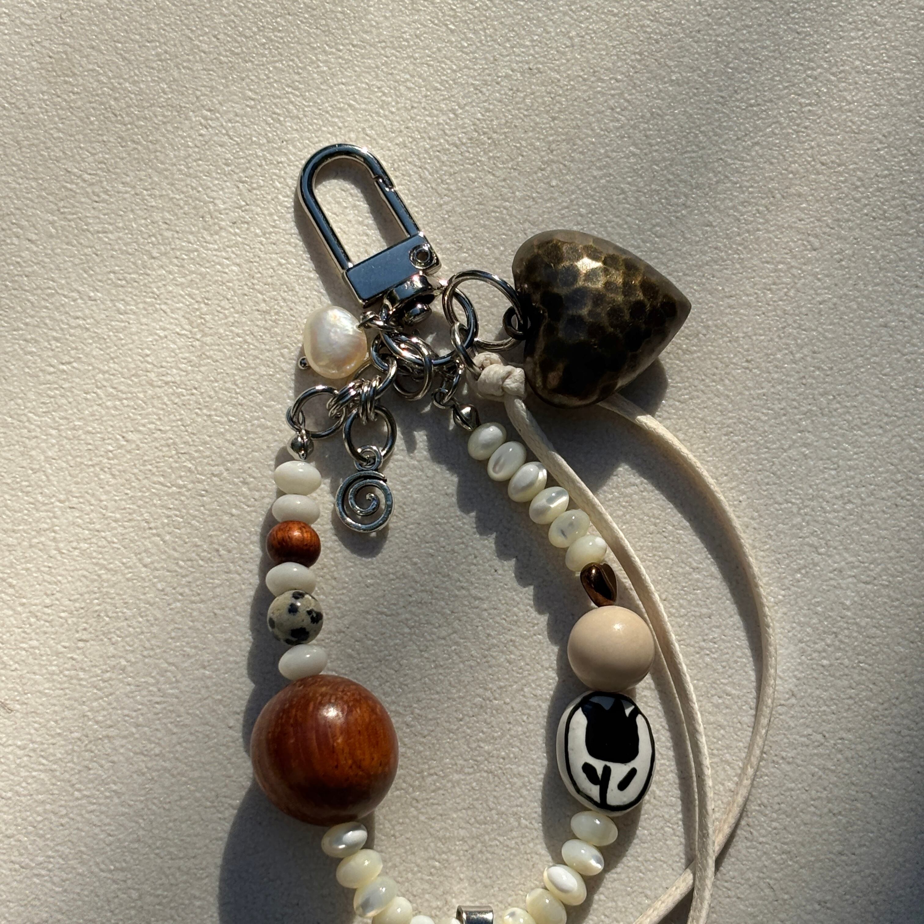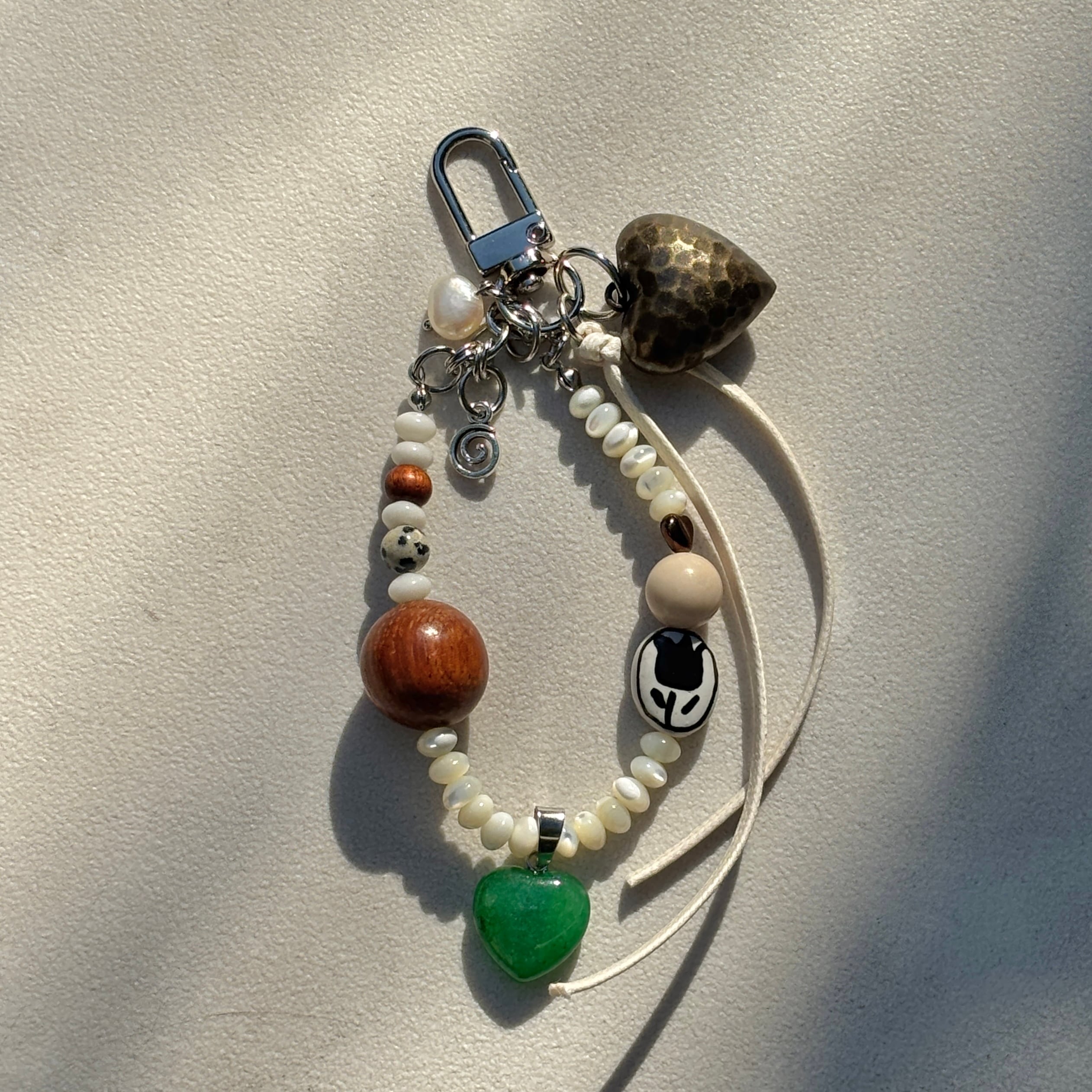 様々な素材のパーツを組み合わせて作ったチャーム。