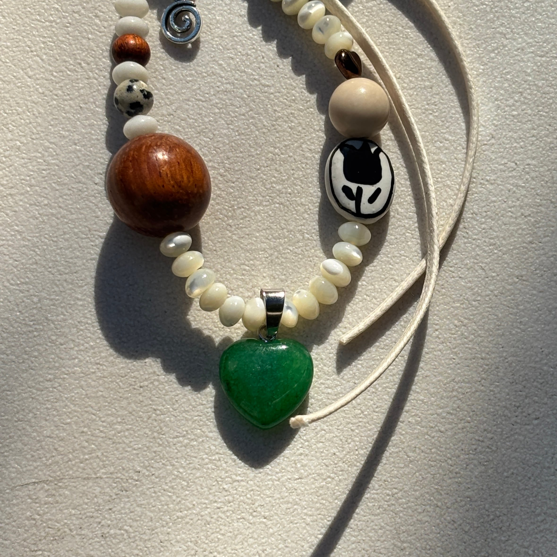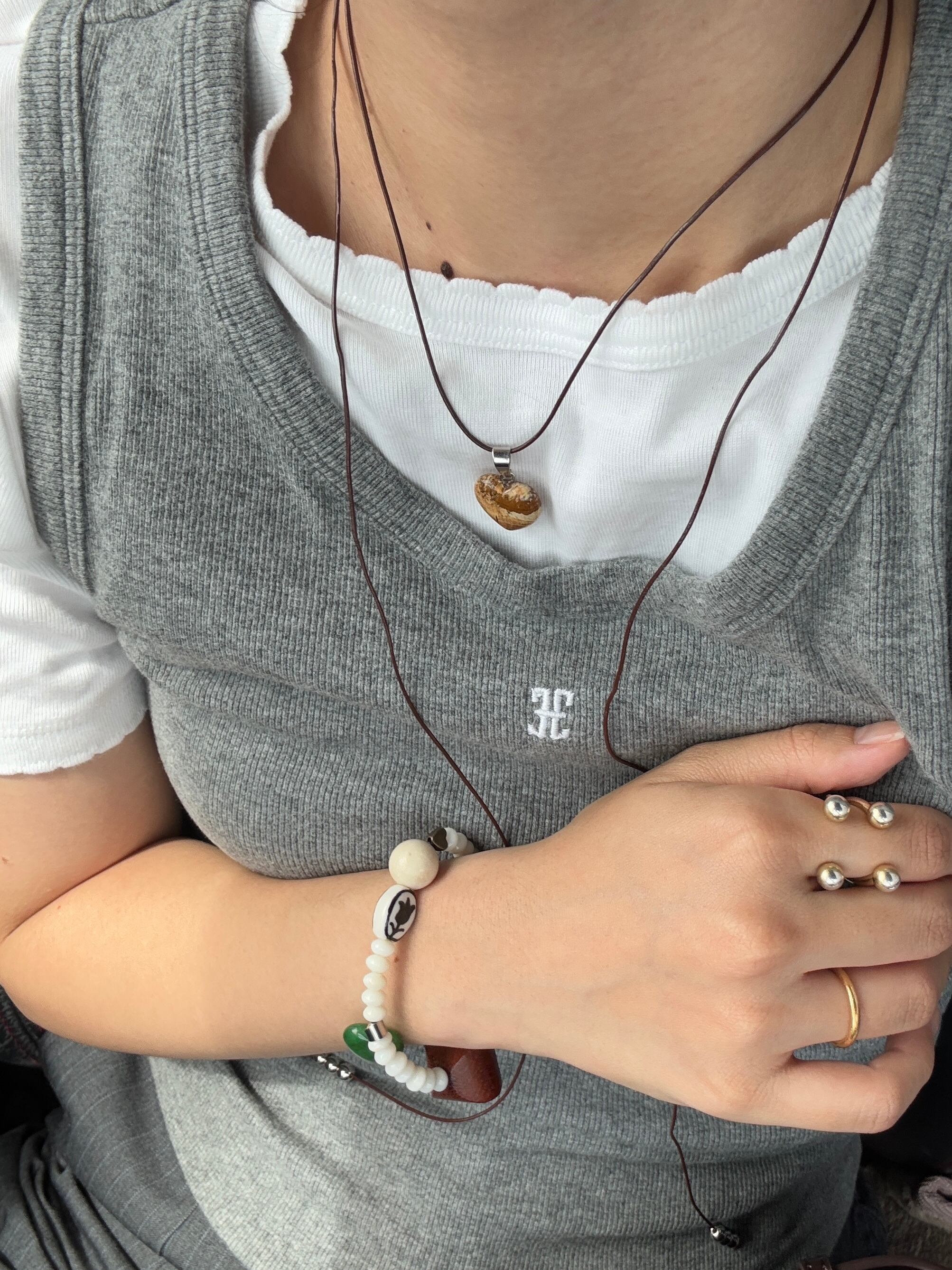 material : 天然石、ウッドパーツ、白珊瑚、陶器パーツ、樹脂、丹銅、紐