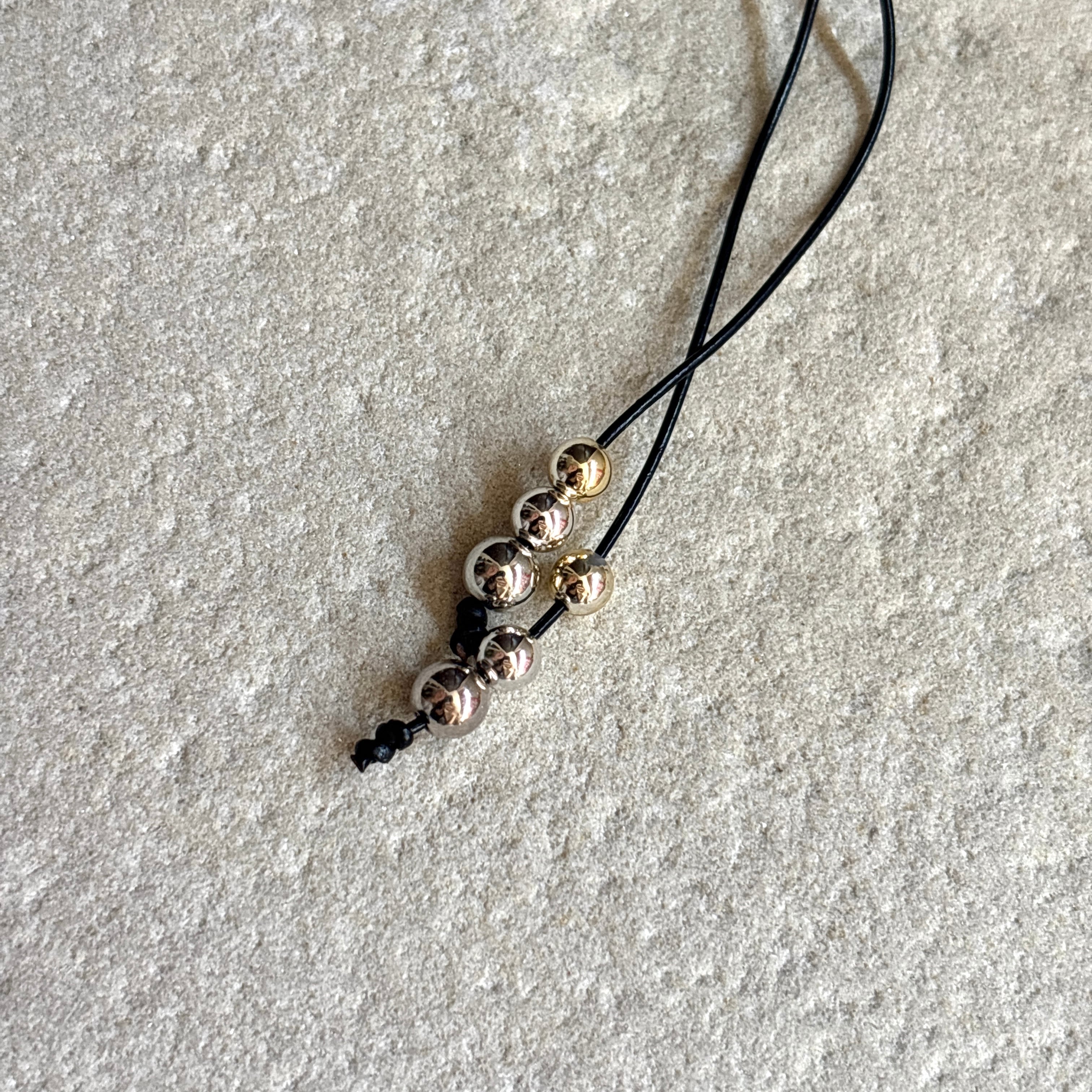 レザーの細めの紐とゴールドとシルバーのバイカラーの珠が少しモード要素を強めて