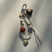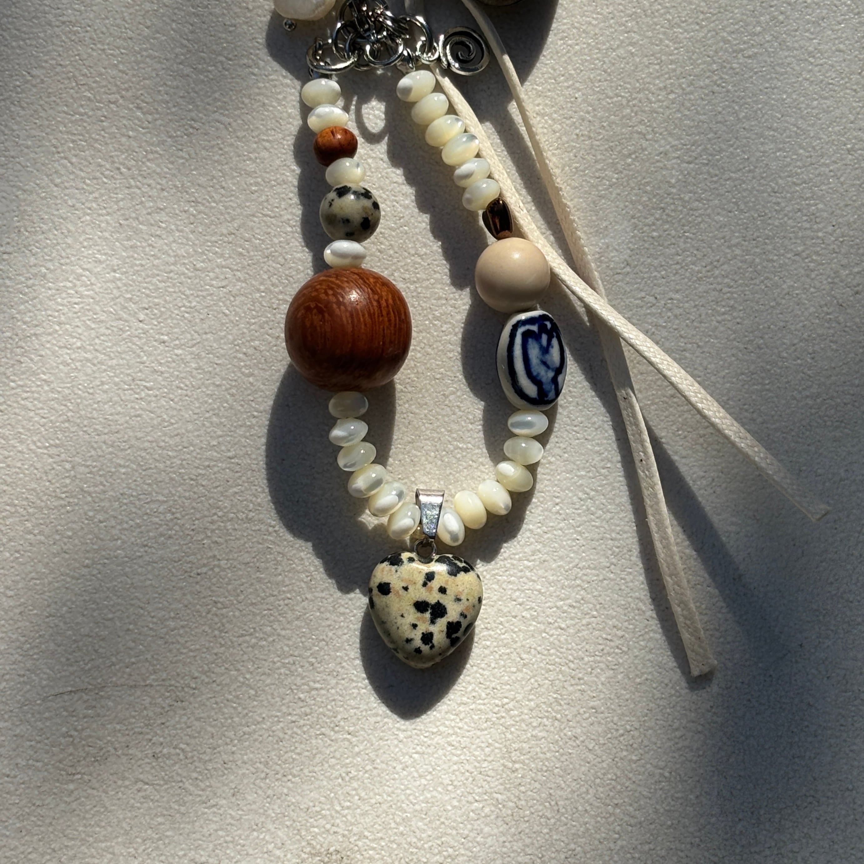 material : 天然石、ウッドパーツ、白珊瑚、陶器パーツ、樹脂、丹銅、紐