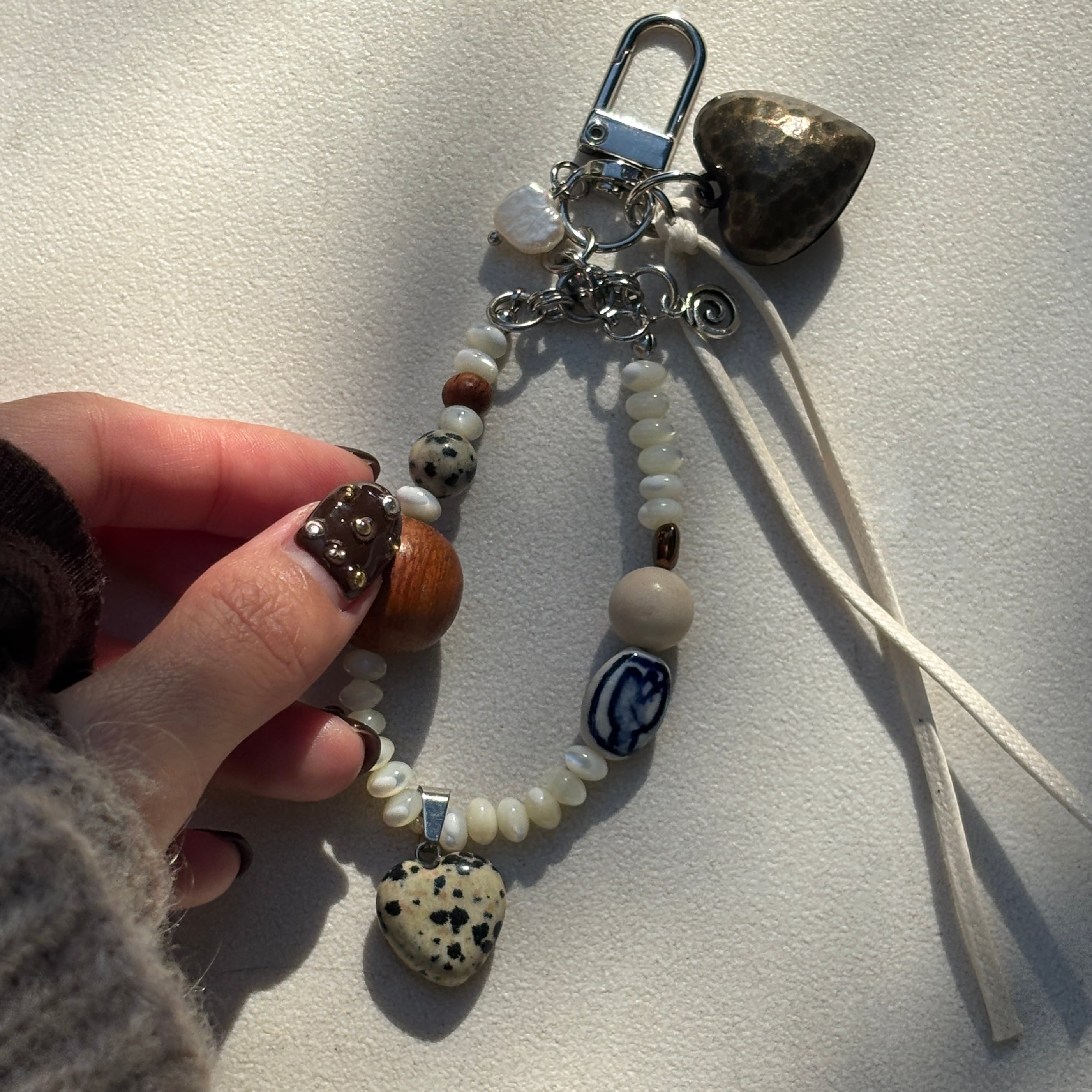 様々な素材のパーツを組み合わせて作ったチャーム。