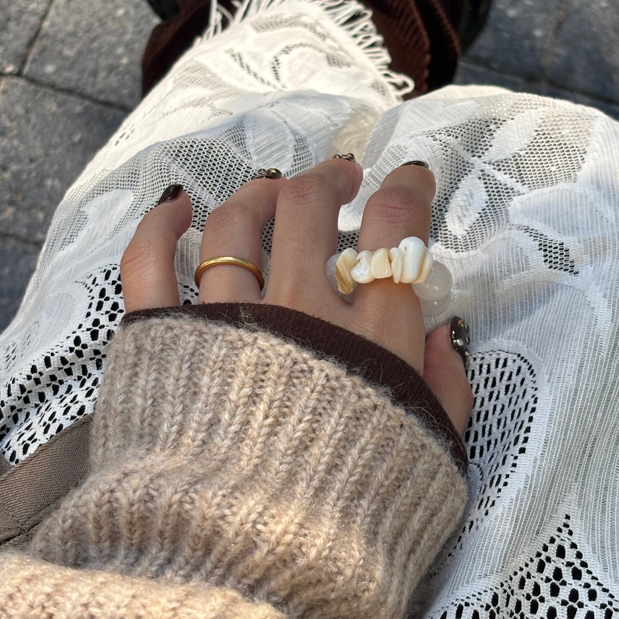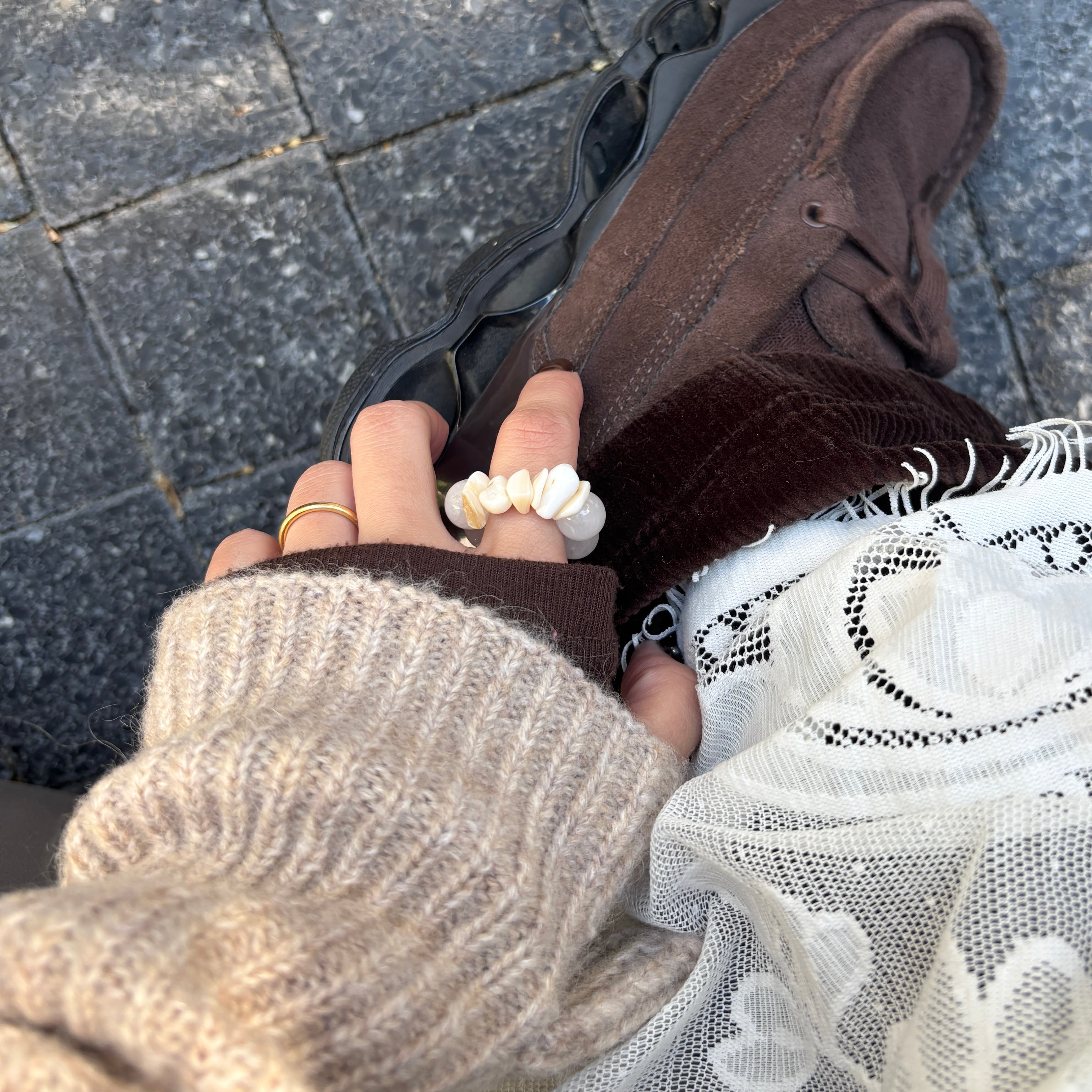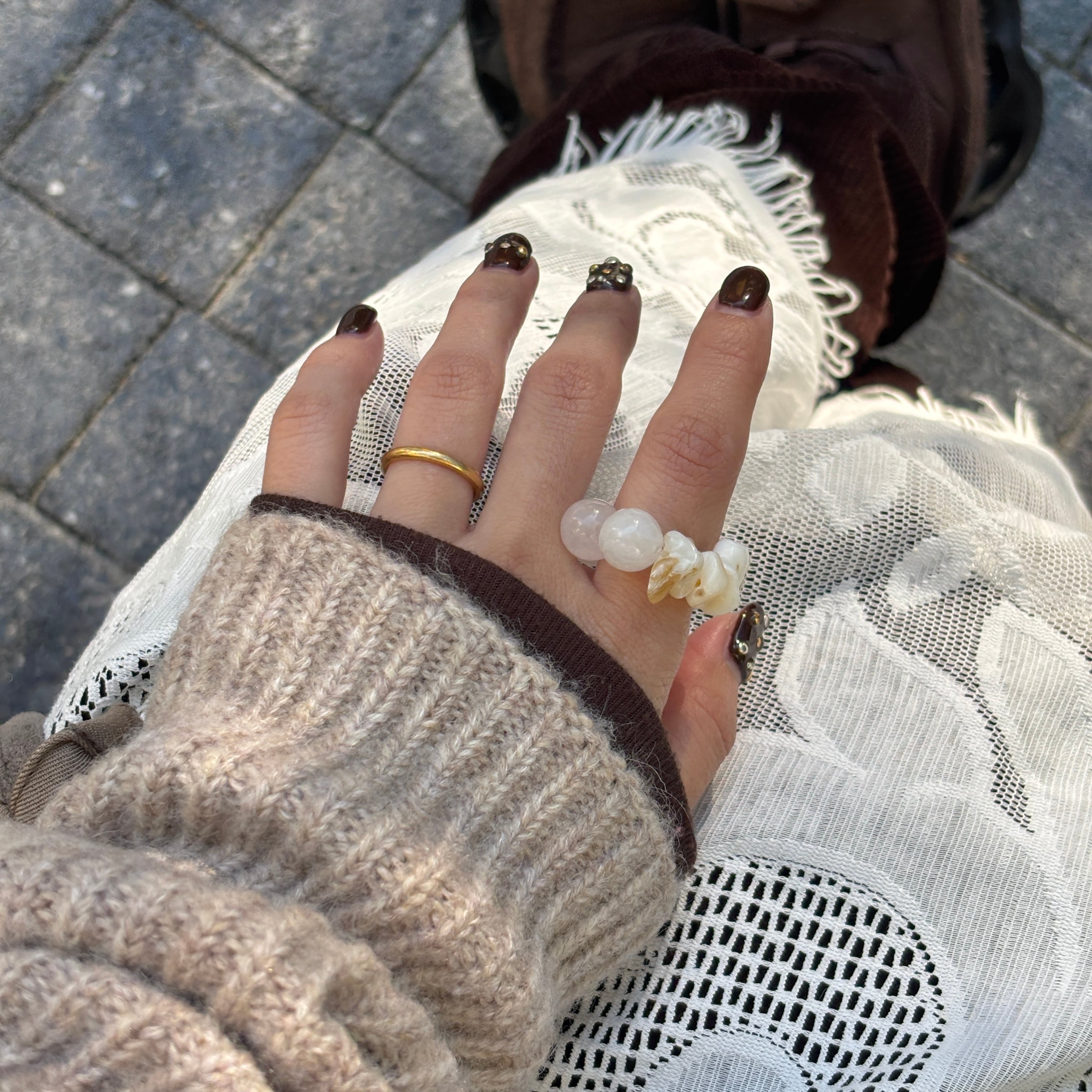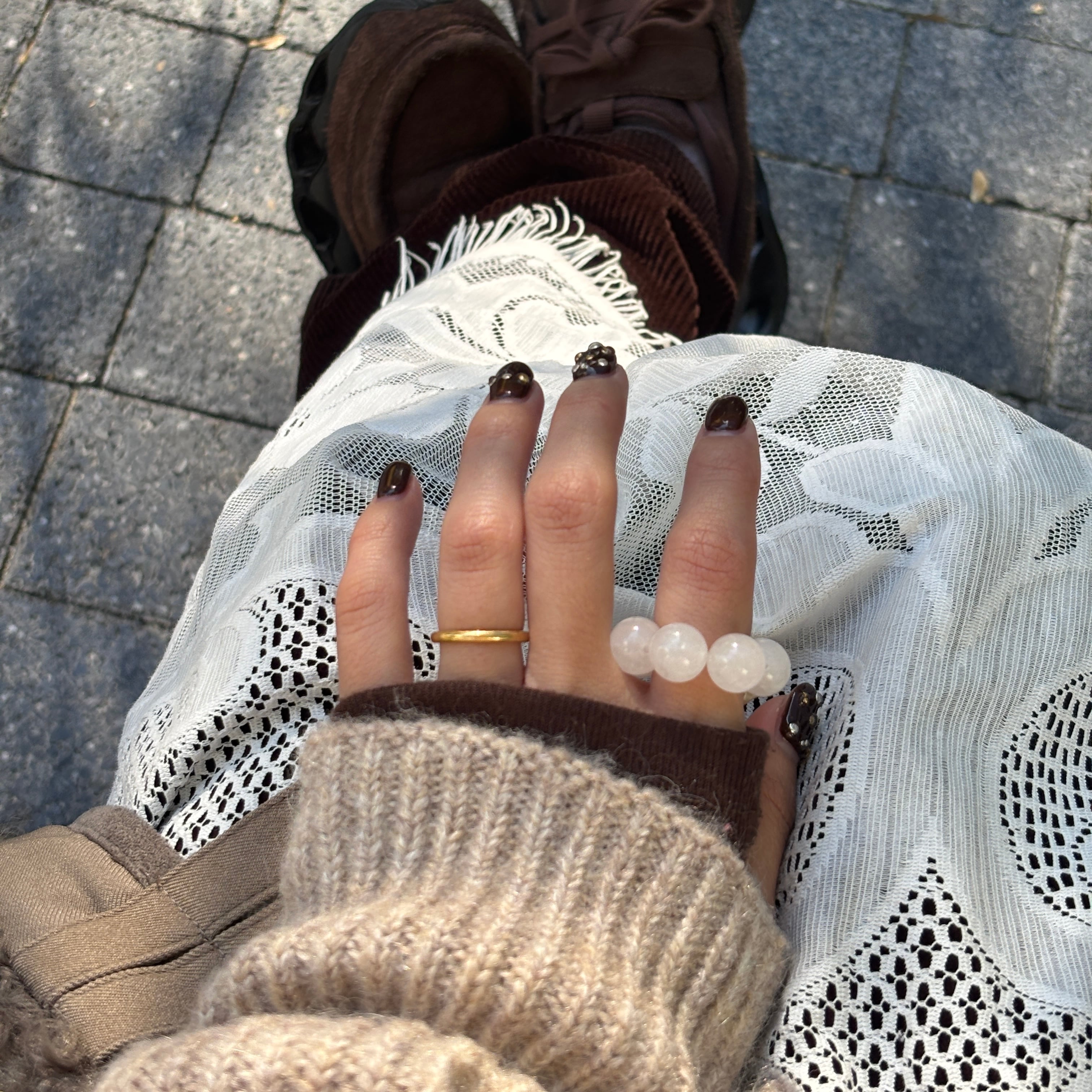 真ん中に見せる付け方や、上から見ると半分ずつになるような付け方、さらに手のひら側に回して敢えて見せない付け方の3wayでお楽しみいただけます。(私は半分ずつ見せる付け方が特に好きです!)
