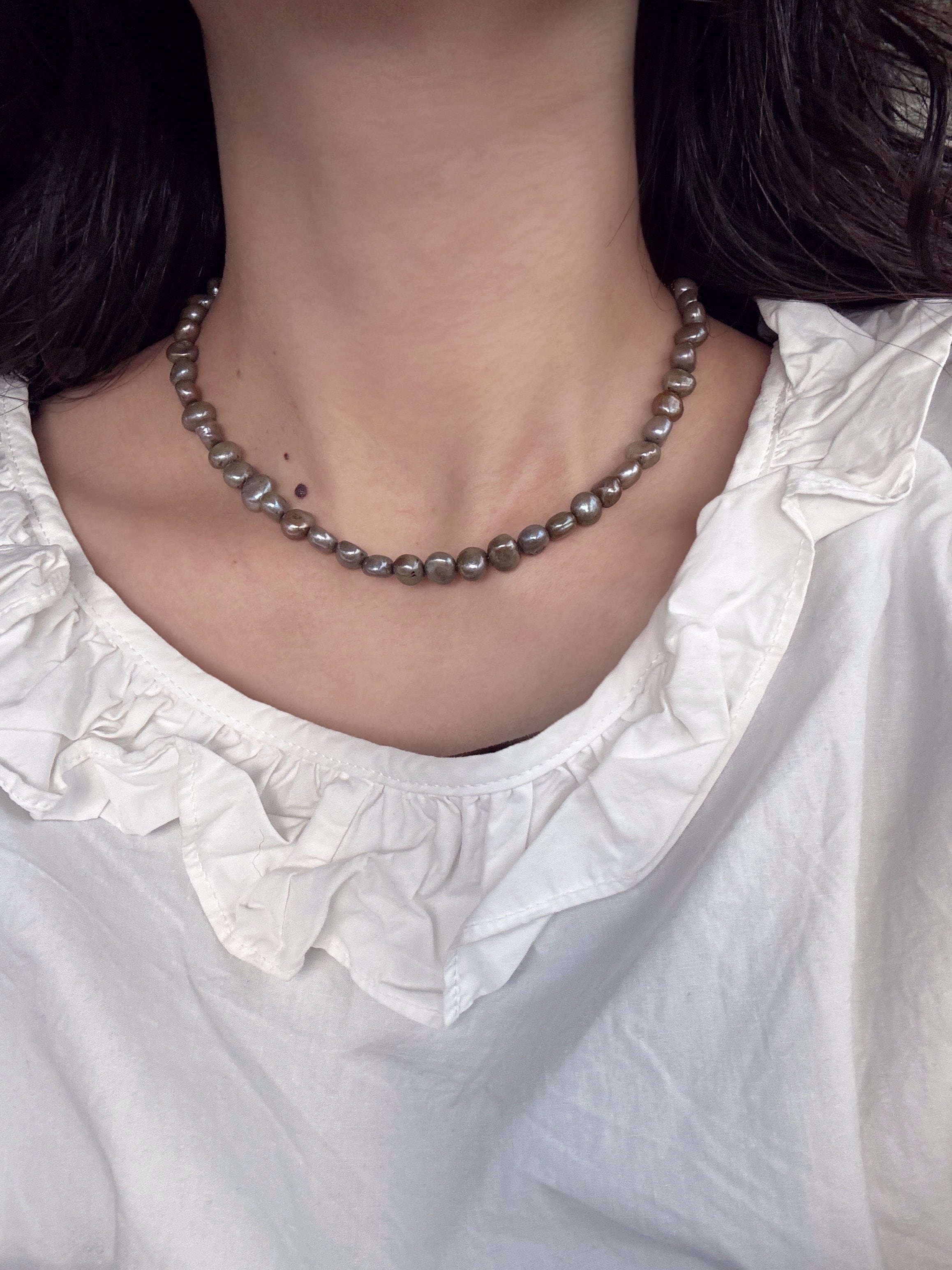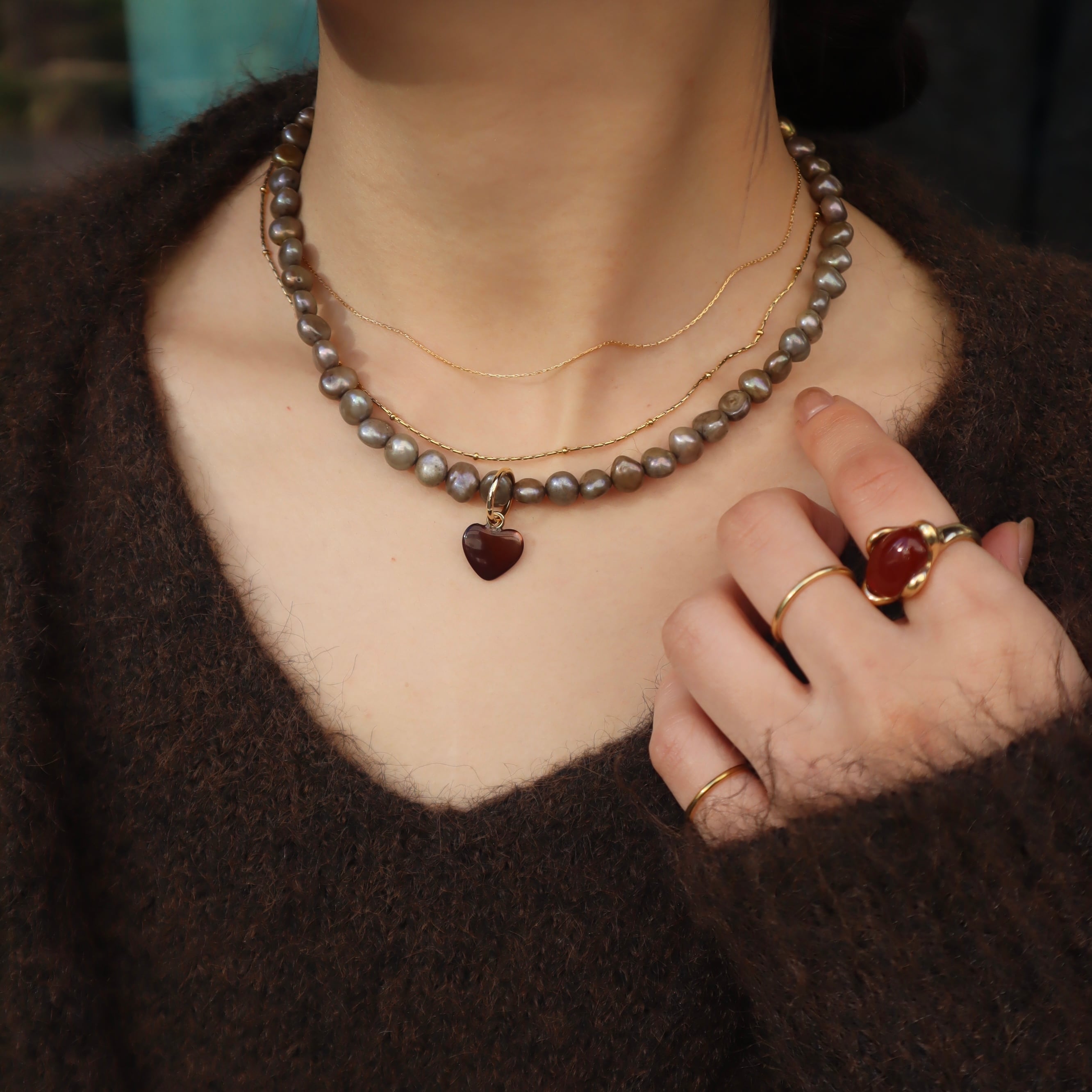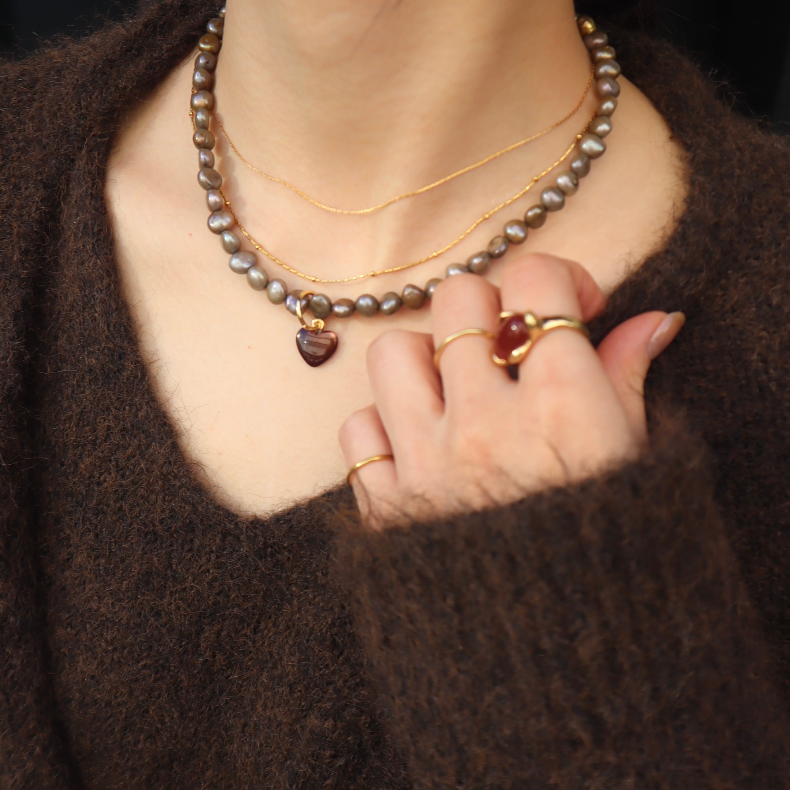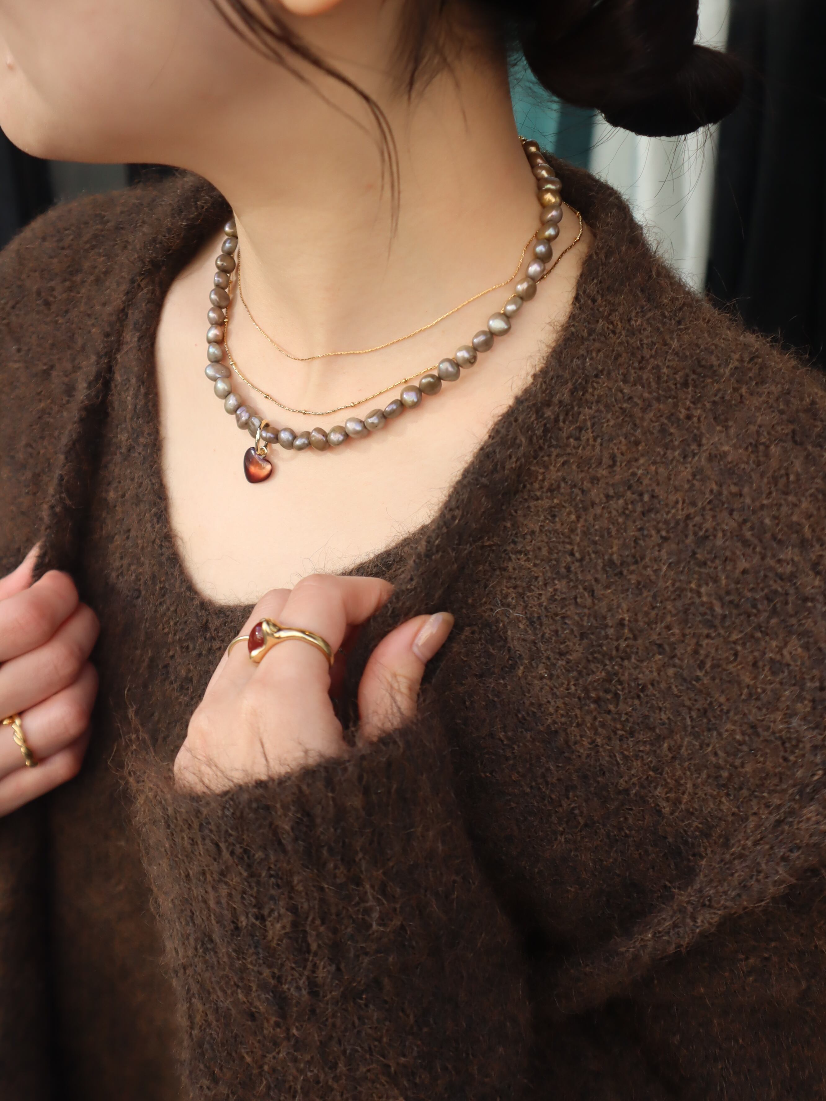【unu】brown shell heart necklace (gray pearl)
