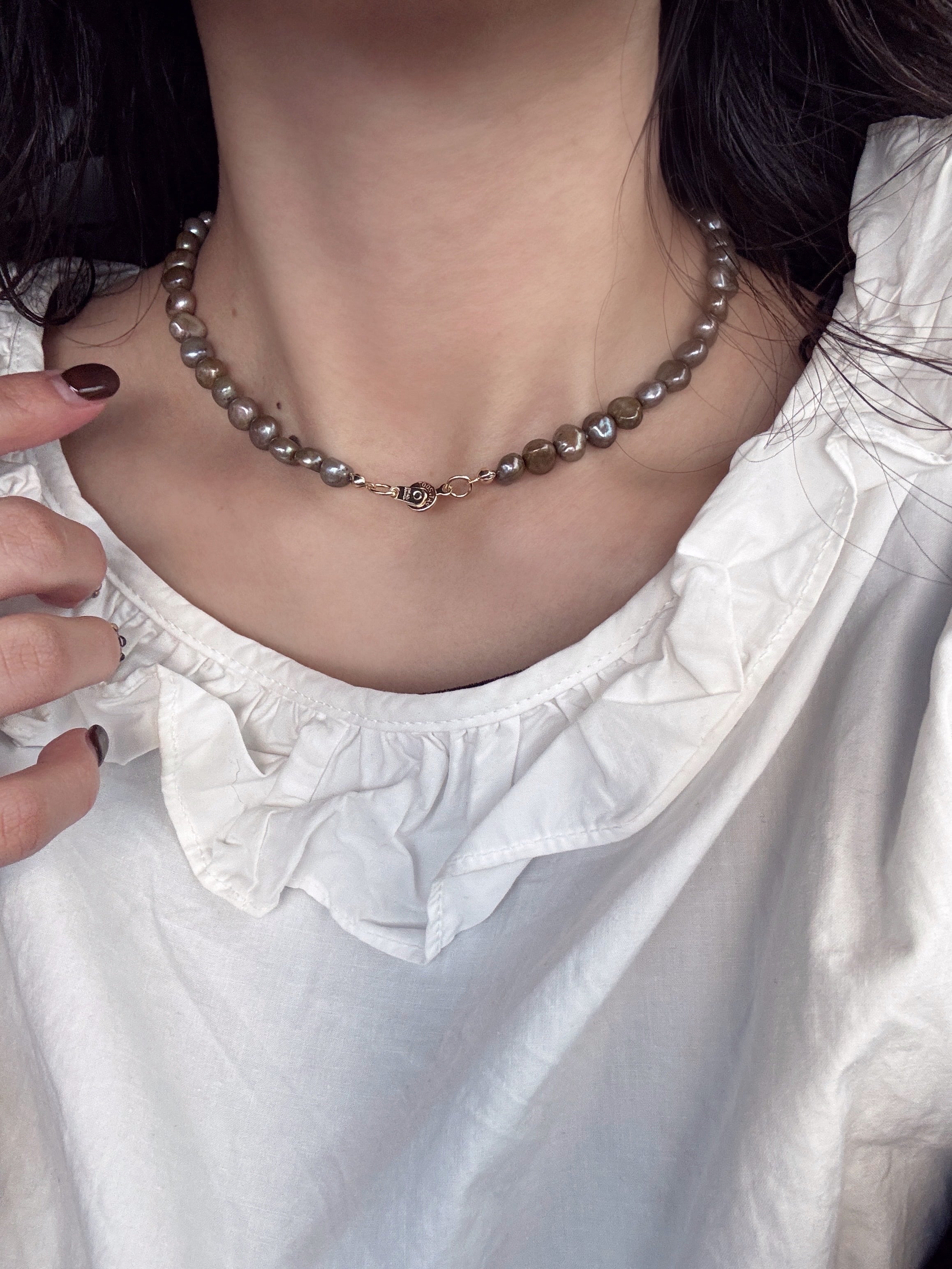 ホリデーシーズンのお出かけにもつけたくなるような淡水パールのネックレス。
